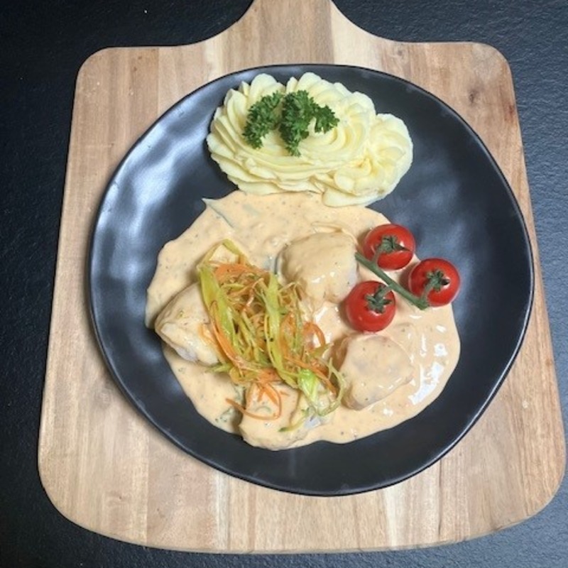 HG Kabeljauw met kruidenpuree, warme groentjes en een heerlijk sausje